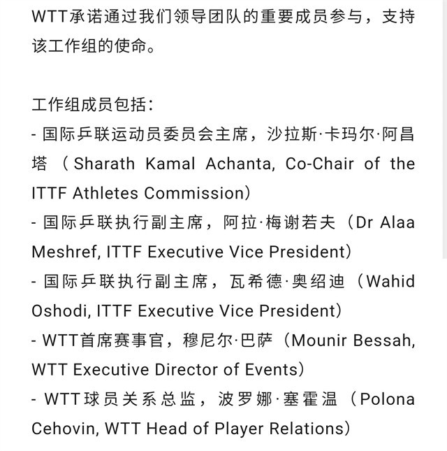 而且,刘国梁身为国际乒联第一副主席、WTT世界乒联主席,他本身就是被审查的对象,因此不可能让他“既当裁判又当运动员”,大名单没有他也是十分合理的。虽然没有刘国梁及其爱徒刘诗雯的参与,但是WTT世界乒联表态,完全支持国际乒联执行董事会关于成立专门工作组,支持该工作组的使命。